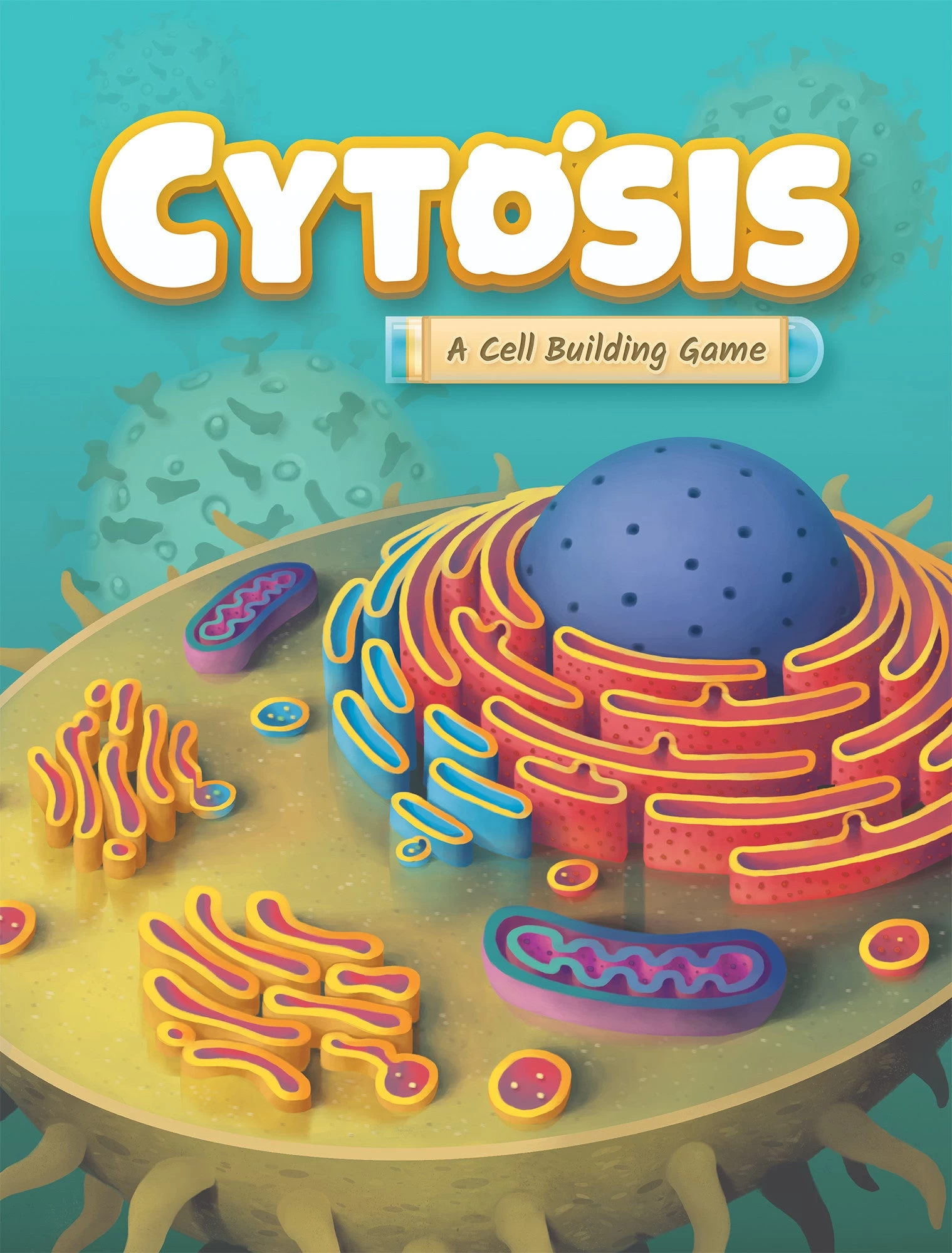 Cytosis: A Cell Building Game is a worker placement game that takes place inside a human cell. Players start out with a number of workers and on a player’s turn, they will place one of their workers in any available location within that cell. Some of the locations provide players with resources (e.g., mRNA, ATP); some with actions (e.g., convert resources, collect cards). Resources are used to build enzymes, hormones and/or receptors, which score Health Points. The player with the most Health Points at the end of the game wins!