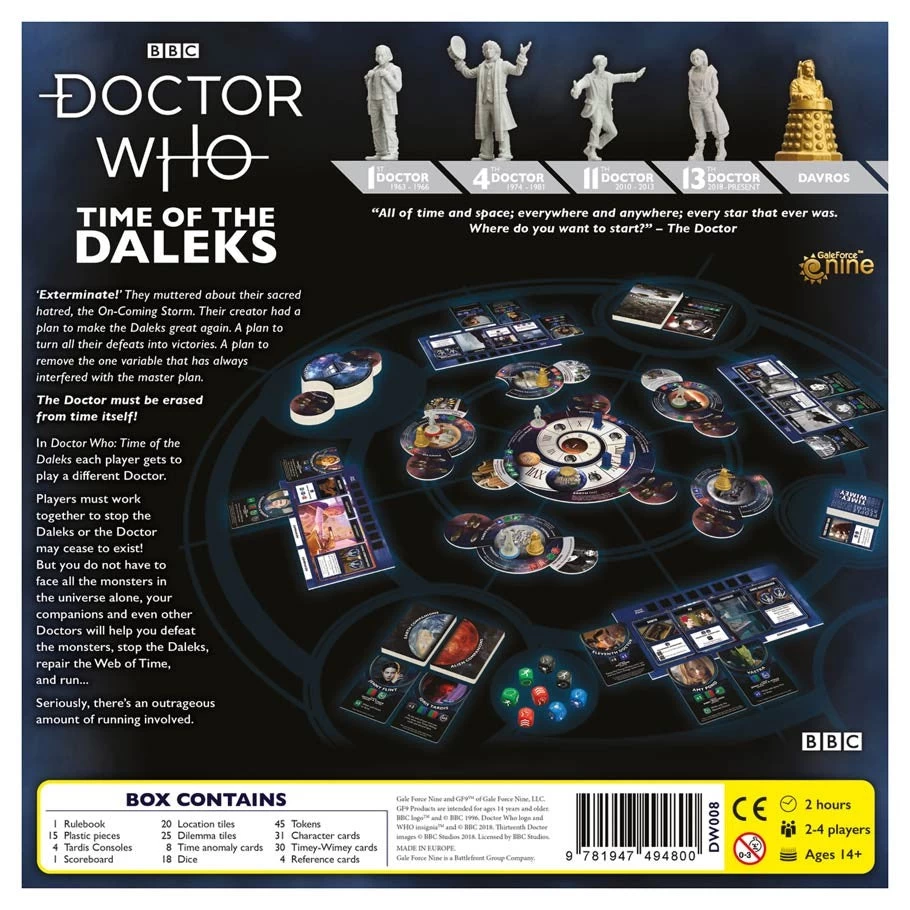 Doctor Who: Time of the Daleks is a semi-cooperative board game that puts players in the roles of their favorite Doctor, pulled from various timelines to stop the Daleks: Either one player/doctor wins, or the Daleks win and all the players/doctors lose.