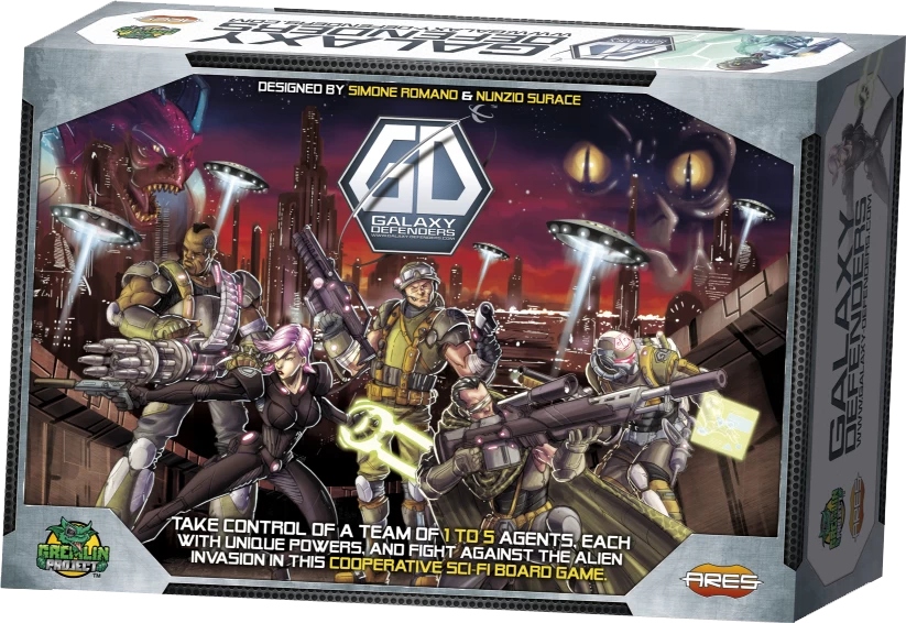 Galaxy Defenders is a sci-fi cooperative, tactical battle game in which 1-5 players fight together against an oncoming alien menace. Each player takes control of one or more agents with unique powers to defend the planet from the alien invasion. Gameplay revolves around a tactical combat system, using custom ten-sided dice. Each player sequentially plays his Agent turn and then one Aliens turn. Players carry out their turns [agent and aliens] in clockwise order until the last player finishes his Aliens turn. Once done, the game passes to the Event phase that will bring the players to the next round. Players may choose up to five agents: