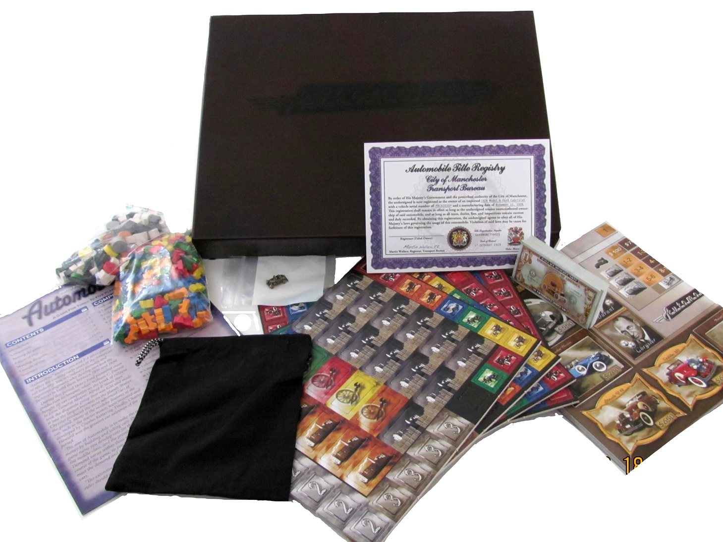 Automobile is a 3-5 player game that bears a modern setting when compared to most of Wallace’s releases. Players are competing in the U.S. auto industry in the early 20th century, purchasing factories that turn out low-, medium- and high-valued vehicles, starting with the 1893 Duryea and moving through history from there.