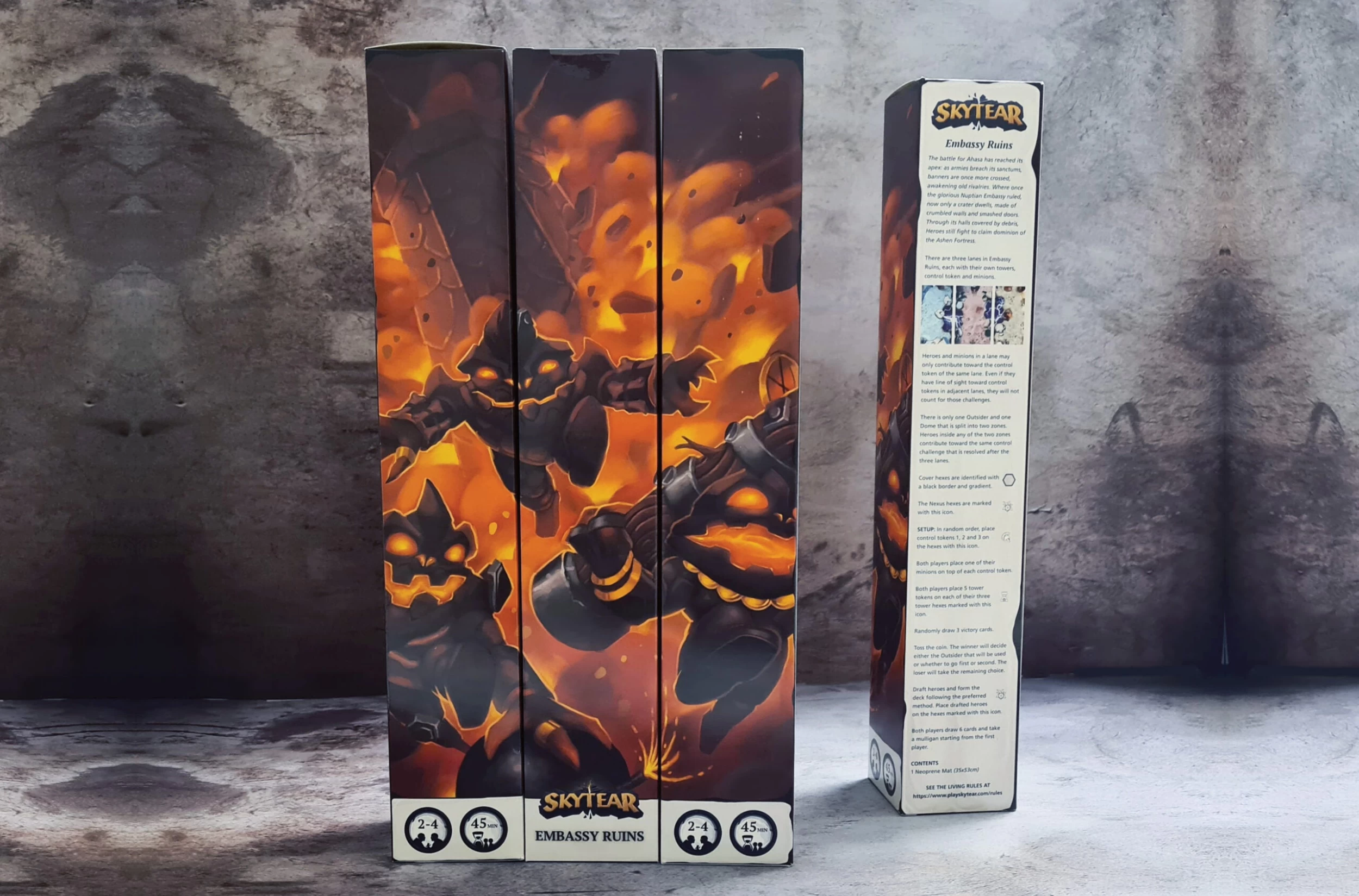 Embassy Ruins is a new and quick-to-play 3-lane battlefield supporting 4 heroes per side. The box contains a neoprene playmat with stitched edges measuring 35x53cm (14x21in).