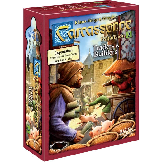 Some tiles also feature symbols for the goods Wine, Cloth and Wheat. Players collect one of these goods when the feature that has it on the tile is scored. Players with the most of each type of good gets bonus points at the end of the game. There is a popular house rule that allows the trading of goods between players in exchange for other goods and the ability to chose where a tile is placed. There are also two new wooden playing pieces in this expansion. The Builder is like a meeple in that it may be placed in a city or road as a kind of supervisor. A subsequent tile extension of the feature the Builder is in allows the player another tile placement. Farmers will also be able to place a new Pig pawn in a field for extra points at the end of the game.